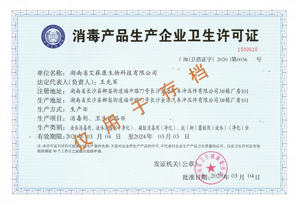 3月4日下午,湖南艾菻康生物科技有限公司順利拿到《消毒產品生產企業衛生(shēng)許可證》。